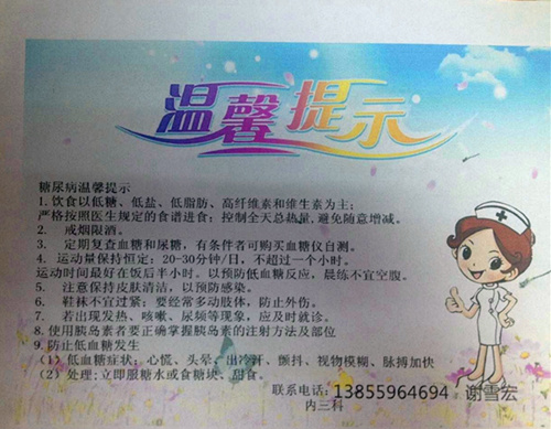 優(yōu)質(zhì)服務(wù)的開(kāi)展拉近了我們與患者之間的距離,使我們之間的關(guān)系變得更加和諧,更加親密。我們科不僅僅是消化內(nèi)科,還是內(nèi)分泌科,這里住著一群“特殊”的病人,他們就是糖尿病病人,可是他們對(duì)糖尿病知識(shí)并不是十分了解,甚至?xí)X(jué)得有些恐懼!他們不知道如何飲食是健康并對(duì)身體有益的;不知道如何去控制血糖;不知道如何去預(yù)防低血糖。就此我們開(kāi)展了糖尿病健康宣教。并且在此期間,我們制作了糖尿病溫馨提示卡,發(fā)放給每位糖尿病患者,并一一細(xì)心地去講解,讓他們懂得如何合理地進(jìn)食,如何適當(dāng)?shù)厝ミ\(yùn)動(dòng),如何正確使用胰島素,如何科學(xué)地去預(yù)防低血糖,上面有我們的聯(lián)系方式,可以24小時(shí)為病友提供健康指導(dǎo)。我們的糖尿病患者逐漸認(rèn)識(shí)到糖尿病其實(shí)并沒(méi)有想象中的那么可怕,看見(jiàn)他們?nèi)諠u舒展開(kāi)來(lái)的笑容,我們也倍感欣慰。