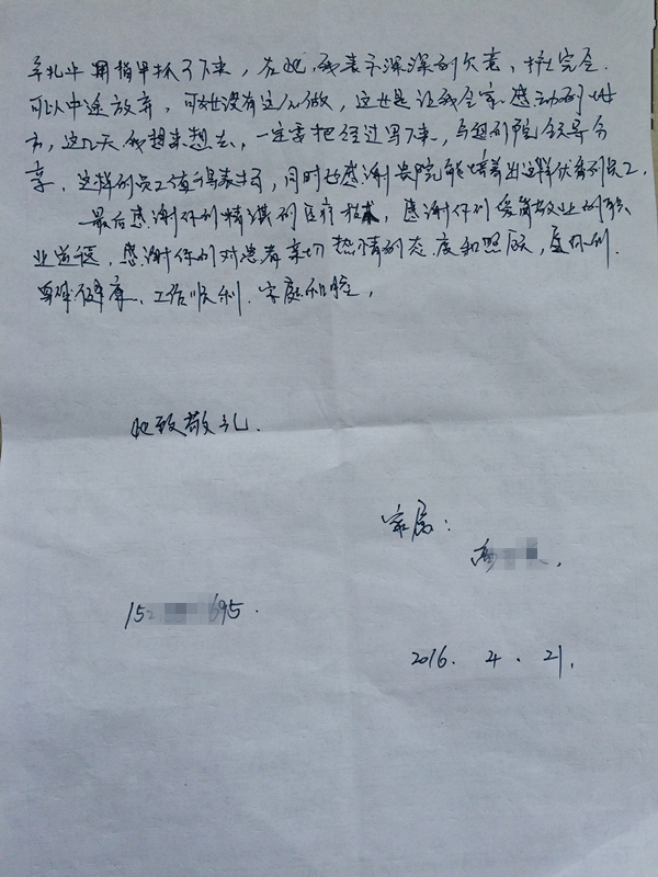這是兒科患者高某某小朋友的爸爸給科室送來的感謝信,高某某小朋友4月13日因高燒不退入院。但因?yàn)楹ε拢∨笥咽值钟|打針,打針過程中,我院兒科護(hù)士葉惠玲被小朋友不小心抓的鮮血淋淋,但是葉惠玲護(hù)士沒有任何怨言,強(qiáng)忍著疼痛,直至將小朋友靜脈穿刺完成。這一幕被小朋友的爸爸看在眼里,內(nèi)心滿懷感激,寫下了這封感謝信,對(duì)我院兒科護(hù)士表示感謝。小朋友也于4月21日康復(fù)出院。